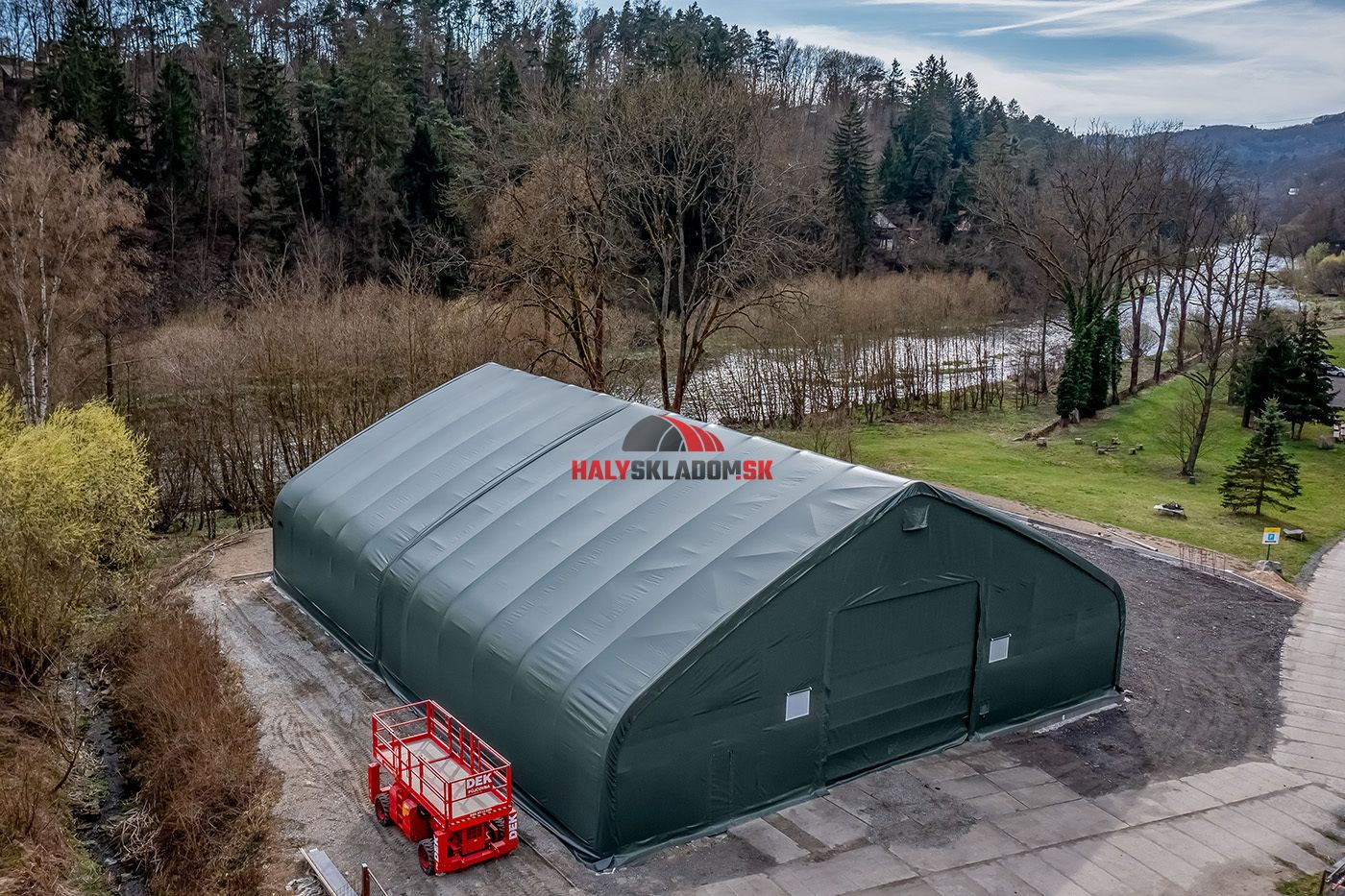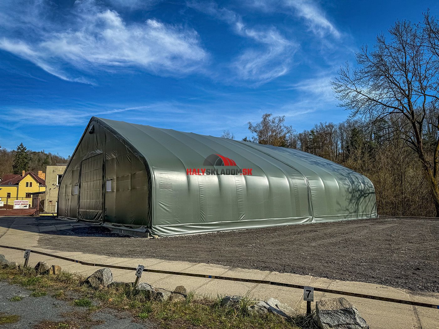 Video predstavuje halu šírky 21,3 m so zelenou plachtovinou gramáže 900 g/m2.