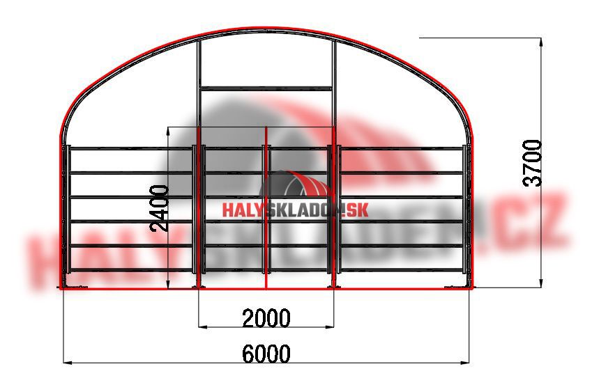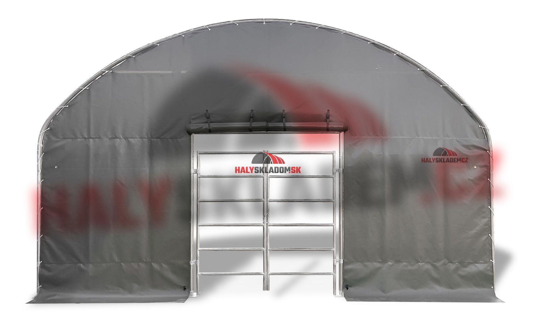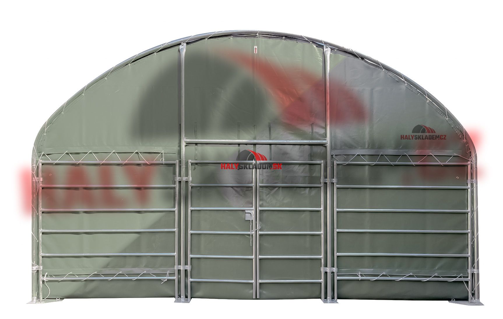 Čelná plachta so zipsovými vrátami na prístrešok pre zvieratá šírky 6 m. PVC plachta gramáže 900 g/m2 so životnosťou až 30 rokov.