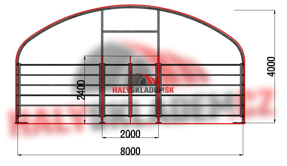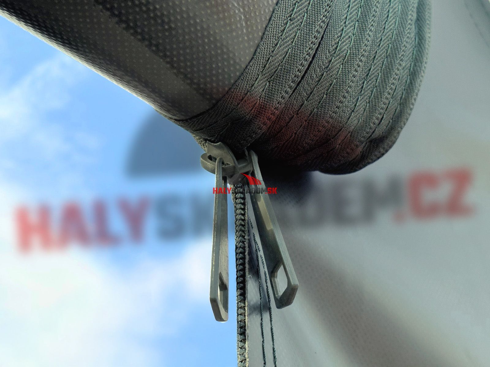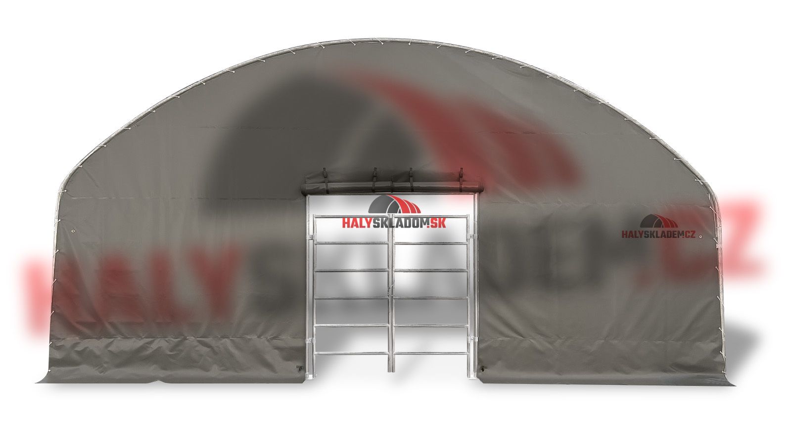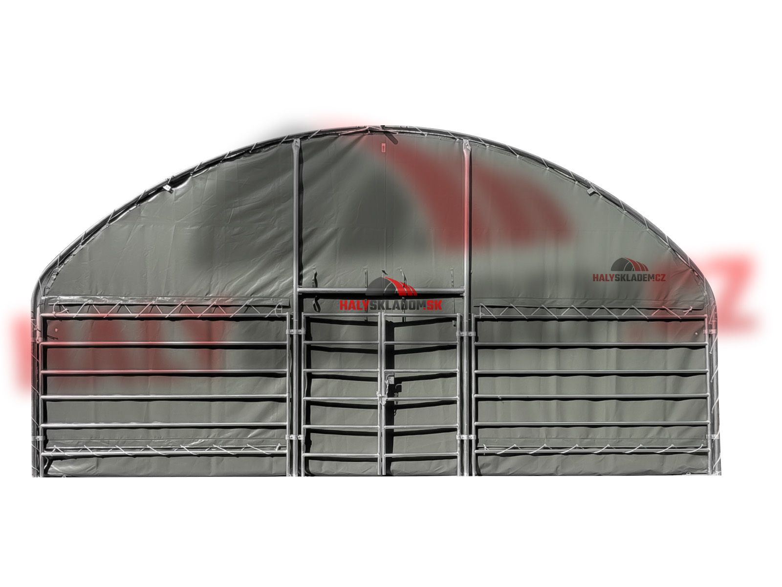 Čelná plachta so zipsovými vrátami na prístrešok pre zvieratá šírky 8 m. PVC plachta gramáže 900 g/m2 so životnosťou až 30 rokov.